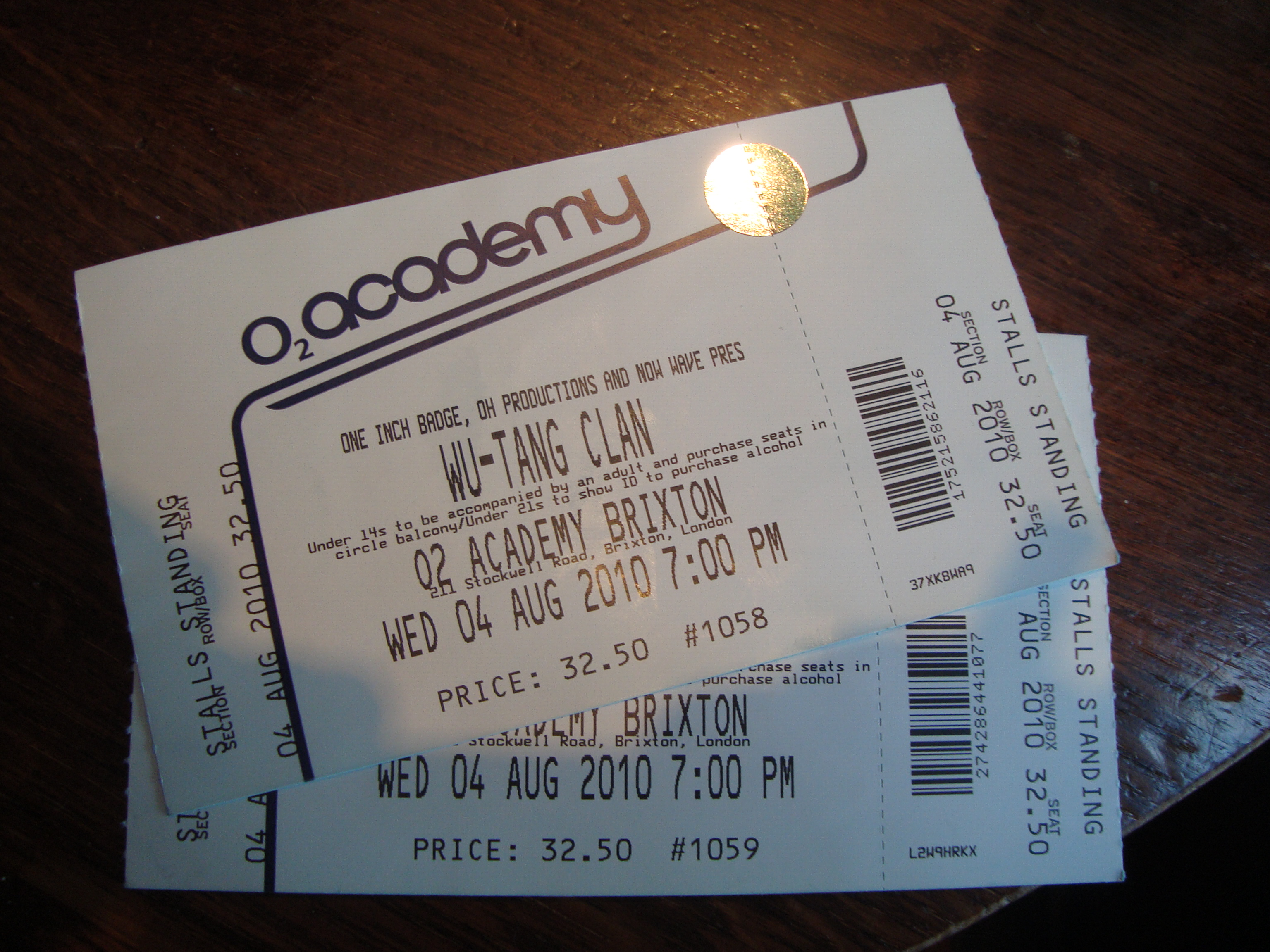 There you go, there’s the tickets owned by myself and Linden Plumley for our trip up to the Brixton Academy in London last Wednesday (4th August) to see the Mighty, the Massive, the Masters, The Wu Tang Clan.