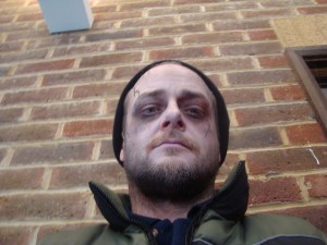 Once we are all made-up we stand outside where around thirty zombies are puffing away on cigarettes. Many of us are in ripped and/or ruined clothes, and I’m thankful that I look like a zombie-bum, complete with beanie hat and body warmer. I might be dead, but I’m not cold… unlike the mere slip of a girl stood next to me who is wearing a thin top and leggings and shivering slightly. I am about to offer her one of my three tops when she mentions that’s she’s training to become a police woman so instead I let her freeze.