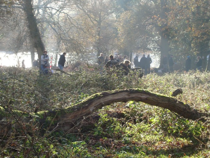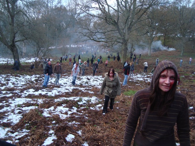 Half an hour later and we’re walking in staggered mobs to the field where shooting will commence. I am in the second group and arrive to find the first gang already in position. Our ‘team’ is herded up a slope and we’re told to spread out and when the main cast run past us we have to start our shambling walk towards them.