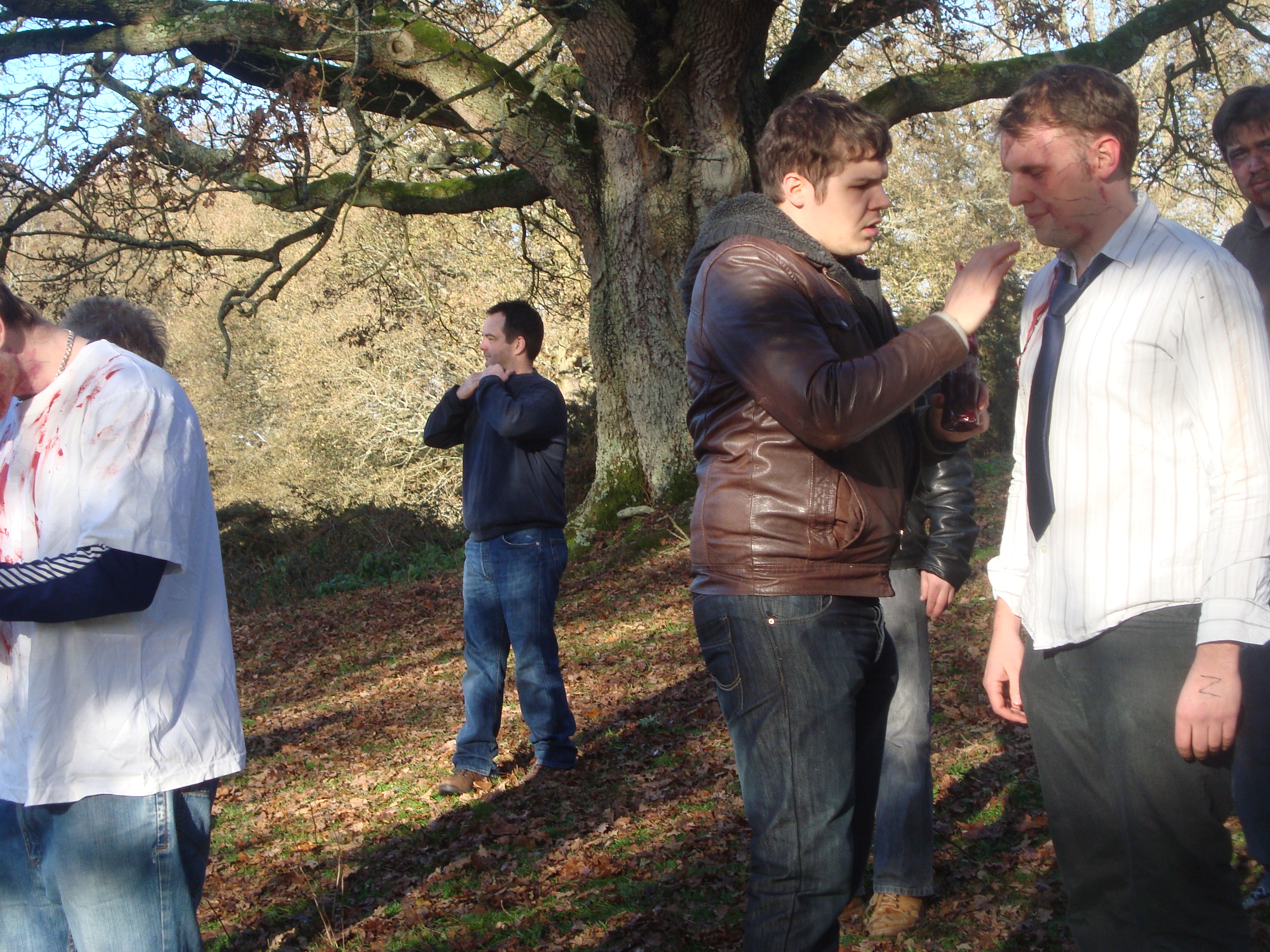 The scene involves four military personnel running through the field and past our three batches of zombies; each group turning toward the sound of gun fire and advancing on them. As they rush past we follow them, which takes us through a patch of bracken, causing two people to fall on their faces, and one young lad was so determined not to ruin the scene he stayed in ‘character’ all the way down, even writhing around in the dirt and snow as one of the undead!